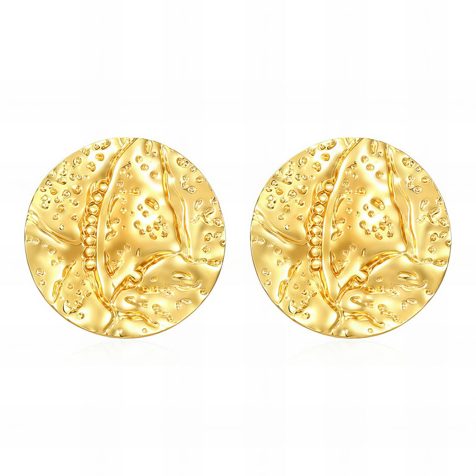 Ez a „CIRCLE” aranyozott texturált kör fülbevaló erőteljes és elegáns darab, amely az egyediségére épít. A nagy méretű, kerek forma és a kalapált hatású, texturált felület különleges fénytörést hoz létre, így a fülbevaló minden mozdulattal másként csillan meg. Kiválóan illik modern, letisztult szettekhez, de alkalmi viselethez is látványos kiegészítő.
