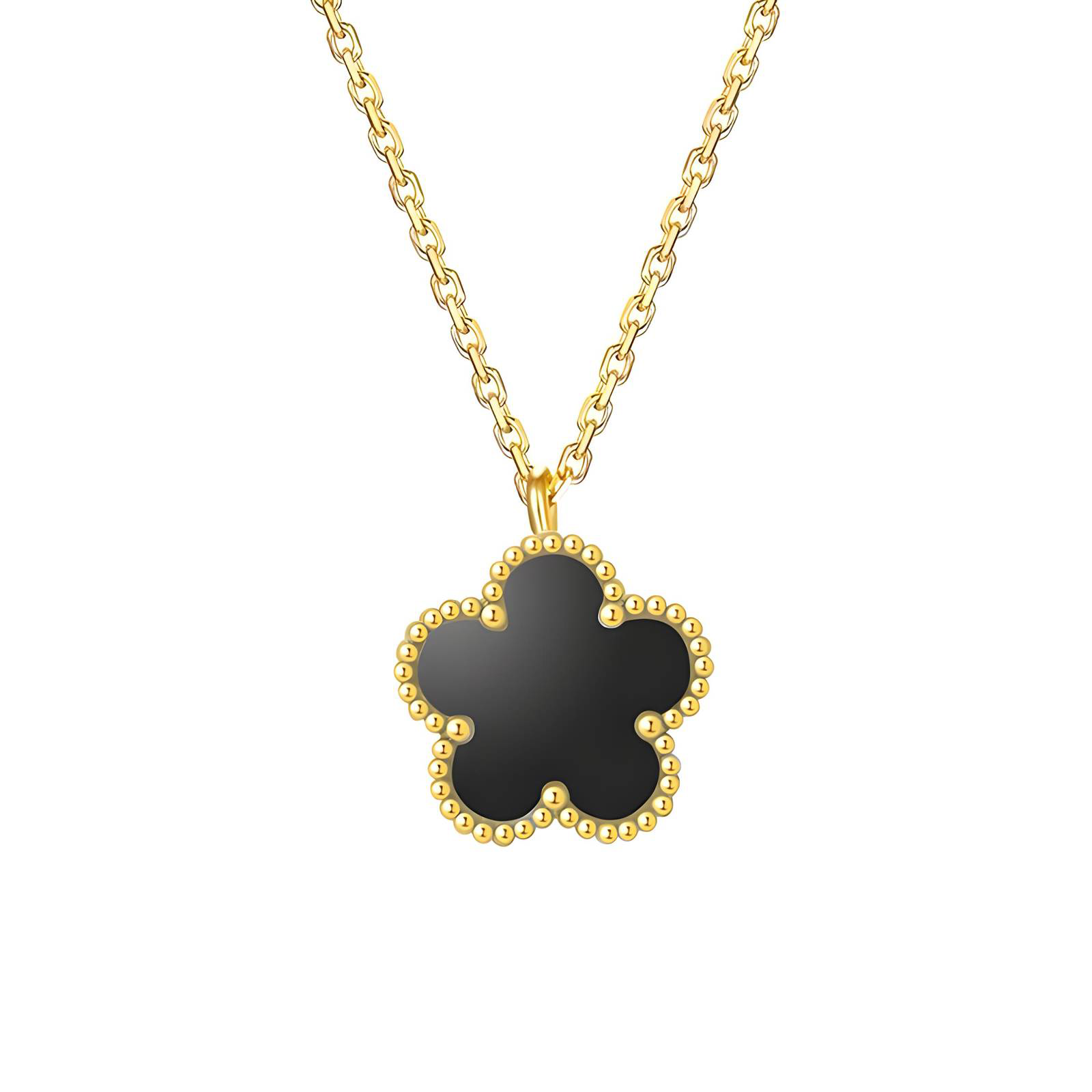 Letisztult, elegáns nyaklánc fekete virág alakú medállal, 18K arannyal bevont nemesacélból, amelyet minden nap magabiztosan viselhetsz.
